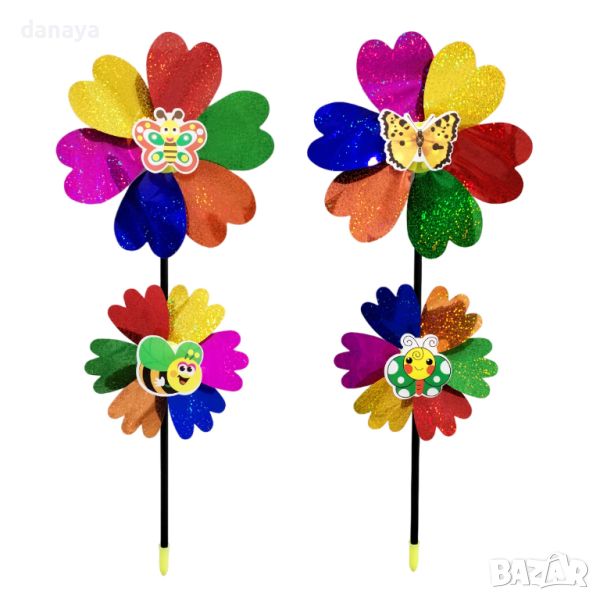 Декорация за градина, балкони, саксии – блестяща вятърна въртележка с форма на цвете и животинче отпред. Ветровъртележка в свежи ярки цветове, които ще внесат лятно настроение, където и да ги поставиш. Въртележките се въртят от вятъра. Може да я поставиш в градината като декорация или в саксия.