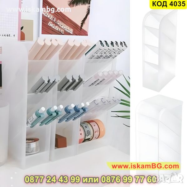 Представяме Ви един практичен органайзер, предназначен за съхранение на канцеларски материали, химикалки или маркери, който ще пасне перфектно на интериора в офиса Ви! С негова помощ Вие ще можете да подредите своите материали и да имате бърз и лесен достъп до тях, като няма да губите излишно време в търсенето им. Настолният органайзер притежава 4 отделения за съхранение, съставен е от висококачествен PP материал.