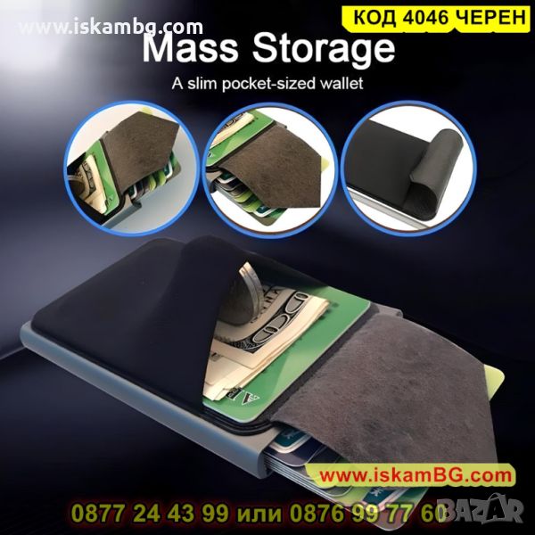 Този портфейл картодържач ще предпази Вашите лични данни в банковите, личните и кредитните Ви карти. Има тънък и стилен дизайн, позволяващ да се носи дори в джоба на панталона Ви. Портфейлът има механизъм наречен RFID защита, който блокира скенерите за радиочестотна идентификация и по този начин Вашите карти ще бъдат защитени от нежелано прочитане на личните Ви данни, също така и бутон за автоматично изкачване на картите. Портфейлът картодържач е направен от полиуретанова кожа и алуминиева сплав, а корпусът му – от алуминий.