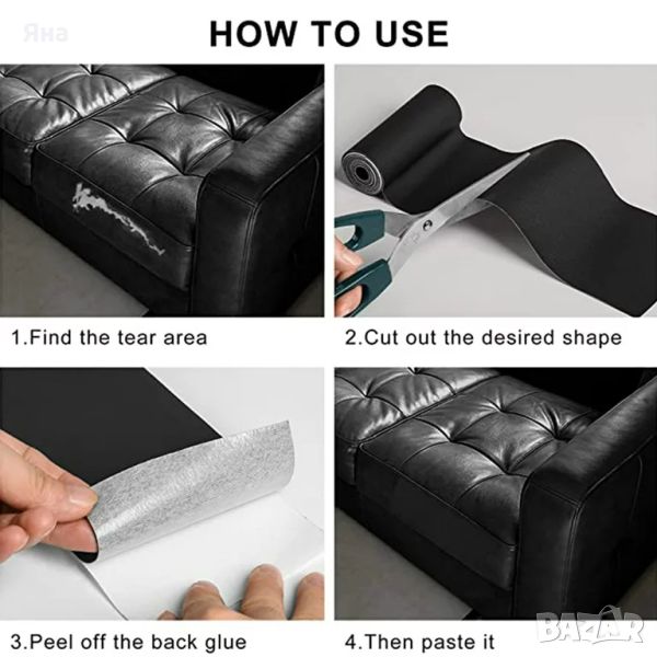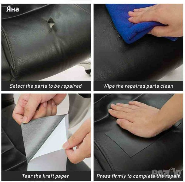 - Кожата е самозалепваща(само трябва да изрежете, колкото ви е необходимо и да отлепите хартията на гърба на кожата, след което залепете върху старата, скъсана кожа);