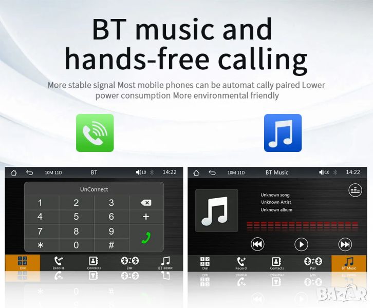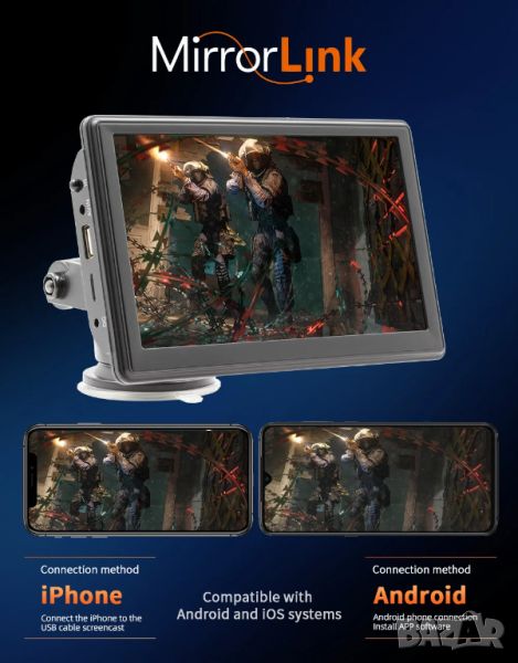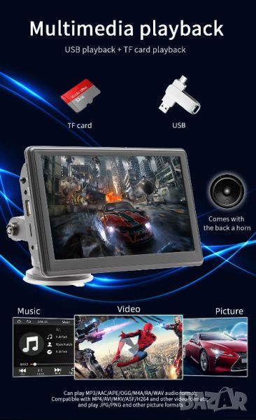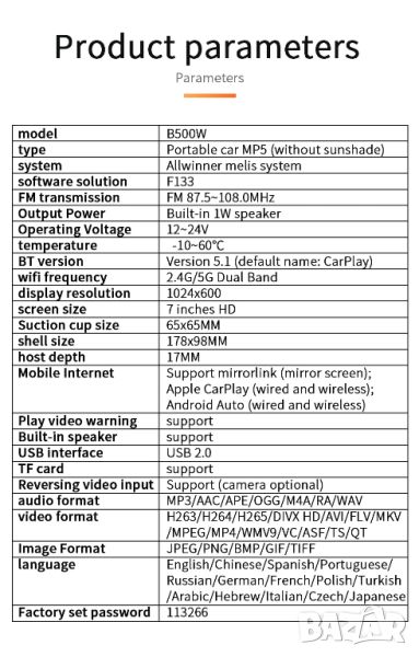 Android Auto Сензорен екран B500+ камера да заден ход • Универсална съвместимост: Този мултимедиен видео плейър за автомобилно радио е съвместим както с безжичен Carplay, така и с безжичен Android Auto, което го прави лесен за използване от всеки шофьор.• Голям сензорен екран: 7-инчовият сензорен екран осигурява ясен и лесен за четене дисплей, което го прави перфектен за навигиране през любимите ви мелодии или приложения.• Лесна инсталация: Със своето разположение в таблото и лесни за следване инструкции, този монитор за кола може да се инсталира бързо и лесно без никакви проблеми.• Висока разделителна способност: Разделителната способност 1024x600 гарантира, че вашите видеоклипове и игри изглеждат остри и ясни, осигурявайки висококачествено визуално изживяване.В сравнение с традиционната 1DIN и 2DIN автомобилна аудиосистема, преносимата стерео уредба за кола B500W е по-лесна и по-бърза за инсталиране. Той дава възможност на домашните механици със своите функции на професионално ниво, но трудността на началното ниво е по-ниска. Не е необходимо да се ангажирате с услугите на техник по електроника, който да ви помогне с монтажа, спестявайки пари, усилия и грижи! Основни параметри Модел: B500WТип преносим: кола MP5Система: система Allwinner melisСофтуерни решения: F133Честота на радиопредавателя: FM 87.5 ~ 108.0MHzРадио предавател IC: AB5301BУсилвател на мощност IC: CS8571EВградена изходна мощност: 1W високоговорителРаботно напрежение: 12~24VРаботна температура: -10~60 ℃Bluetooth версия: Версия 5.0 (име по подразбиране: CarPlay)Wi-Fi честота: 2.4G/5G двойна честота(Използва се само за свързване на игра в кола и Android auto)GPS сигнал: не се поддържаПараметри на производителностПроцесор: F133Работна памет: 1Gbit DRAMпамет за съхранение: неРезолюция на дисплея: 1024x600Размер на екрана: 7 инча HDПараметри на размераМонтажен размер: 65x65MMРазмер на корпуса: 178x98MMДълбочина на мейнфрейма: 17 ммРазмер на цветната кутия: 215x135x95 ммFCL размер: 485x445x290 ммFCL номер: 20 Тегло параметърЕдинично тегло: 0,77 кгFCL нетно тегло: 14,20 кгFCL бруто тегло: 15,50 кг Функционален параметързавъртане на екрана: поддържа сеКамера за заден ход: поддръжкаВъзпроизвеждане на видео: поддръжкаОргани за управление на волана: не се поддържатВидео изход: не се поддържаОфлайн карти: не се поддържатРекордер за шофиране: не поддържаВграден високоговорител: поддръжкаGPS навигация: не се поддържаUSB интерфейс: USB 2.0TF карта: поддръжкаБутон за нулиране: не се поддържаПараметри на RCA портаАудио изход: поддържа сеВидео изход: не се поддържаАудио вход: не се поддържаВидео вход: не се поддържаОбръщане на видео вход: поддръжкаПараметър за форматиранеАудио формат: MP3/AAC/APE/OGG/M4A/RA/WAVВидео формат: H263/h264/h265/DivX hd/avi/flv/mkv/mpeg4/MP4/WMV9/vc/asf/ts/qtФормат на изображението: JPEG/PNG/BMP/GIF/TIFFЕзиков параметърАнглийски, китайски, испански, португалски, руски, немски, френски, полски, турски, арабски, иврит, италиански, чешки, японскиДруги параметриФабрично зададена парола 113266Вижте и другите ми обяви !