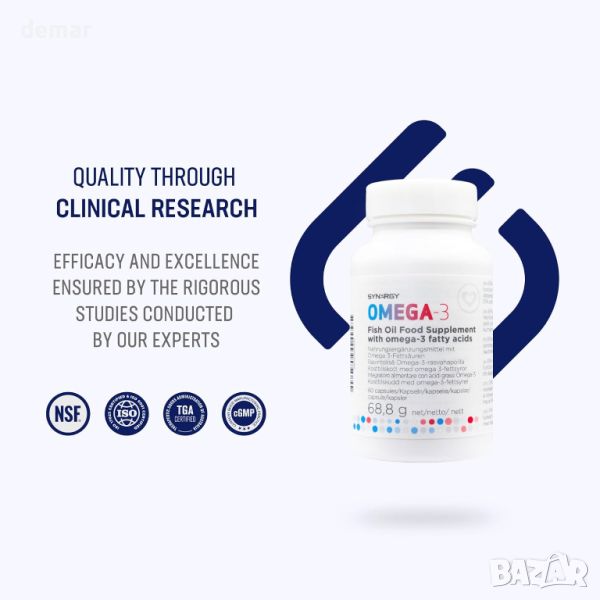 Капсулите Synergy Omega-3 съдържат 1000 mg масло, добито от студеноводни мазни риби като скумрия, аншоа и сардина, богати на EPA и DHA ненаситени мазнини. Тези капсули са с ниско съдържание на замърсители и са ароматизирани с натурално лимоново масло за подобряване на вкуса чрез прикриване на рибенето. Те се подлагат на строги лабораторни тестове, за да се гарантира, че не съдържат