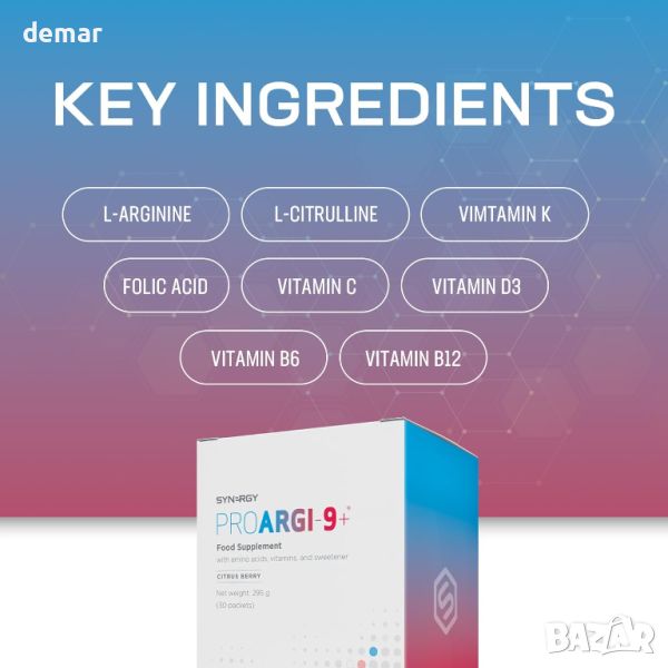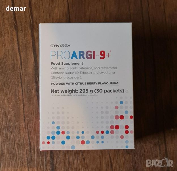 Synergy Worldwide ProArgi 9+ е хранителна добавка, предназначена да подобри здравето на сърдечно-съдовата система и кръвообращението. Всяка опаковка от 295 g съдържа 30 сашета прах с цитрусов вкус, формулиран с 5000 mg L-аргинин и 200 mg L-цитрулин на порция. Допълнително обогатен с витамини C, D3, K, B6 и B12, този продукт поддържа цялостната сърдечно-съдова функция и допринася за по-добро здраве. Тази цялостна смес предлага целенасочен подход за поддържане на здравето на сърцето чрез удобно ежедневно саше.