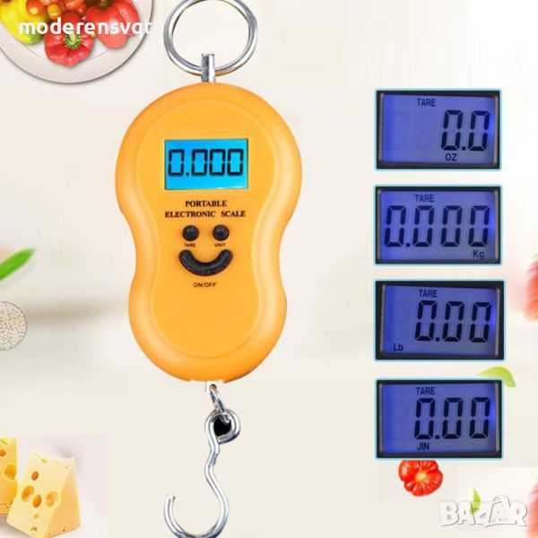 Малък електронен кантар с кука с максимално теглене до 50кг.