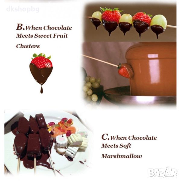 Този шоколадов фонтан е абсолютен хит за всеки повод или парти! Насладете се изискан течен шоколад и топете в него всякакви лакомства като: плодове, бисквити, бишкоти, сладки и много други вкусотийки.