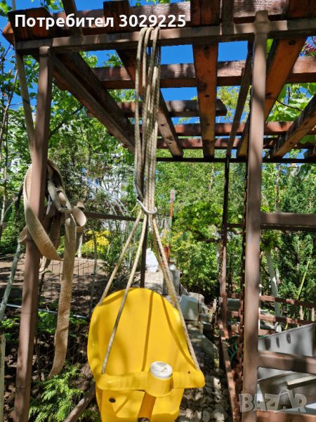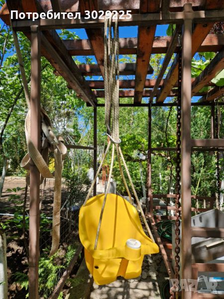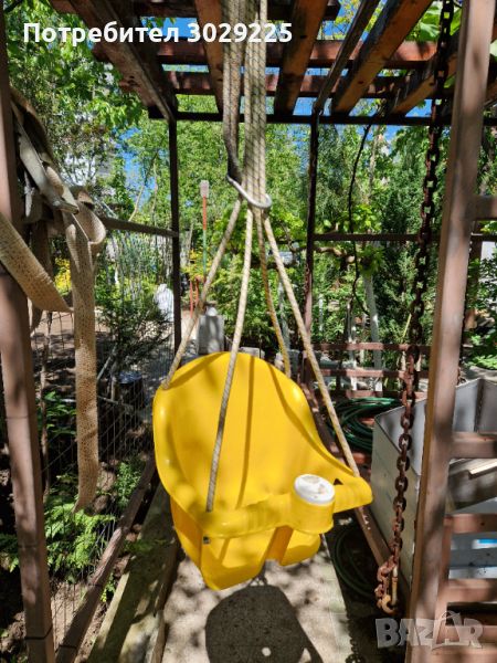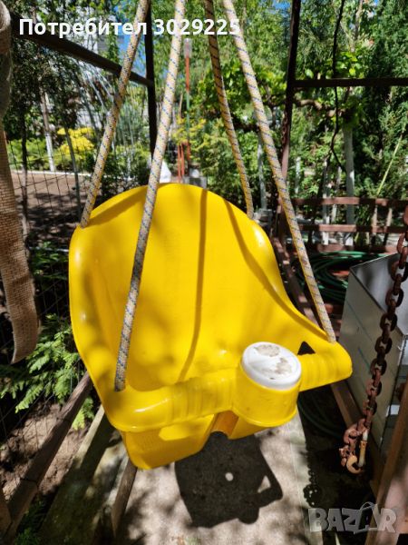 Детска пластмаса люлка. Цвят- жълт. За деца до 25 кг. С дълги въжета, за регулиране на височина и карабинер за закачане.