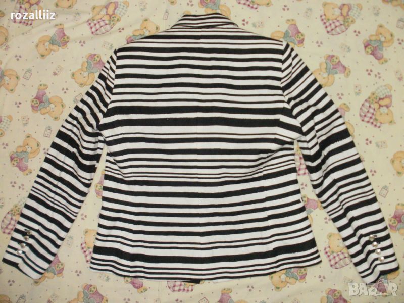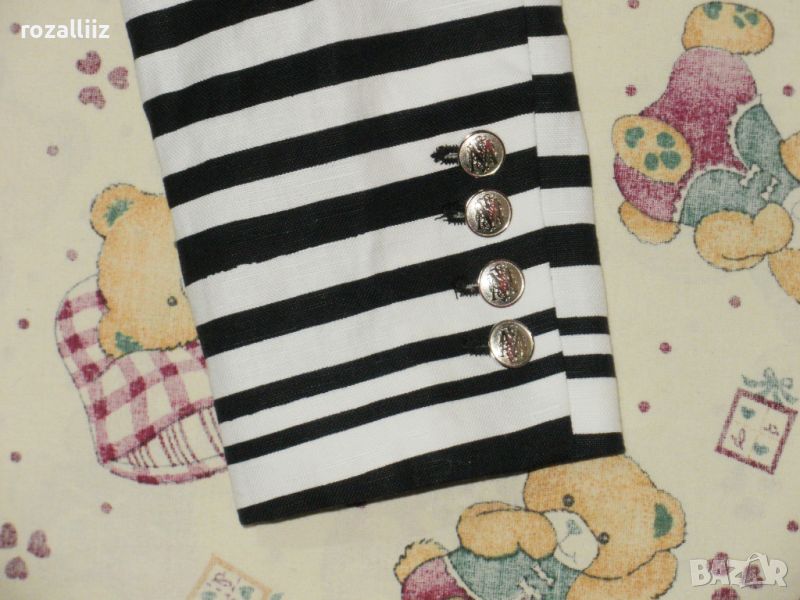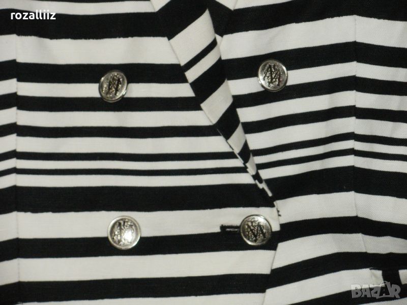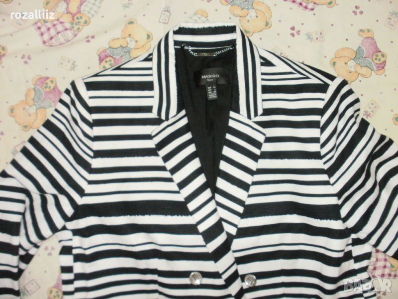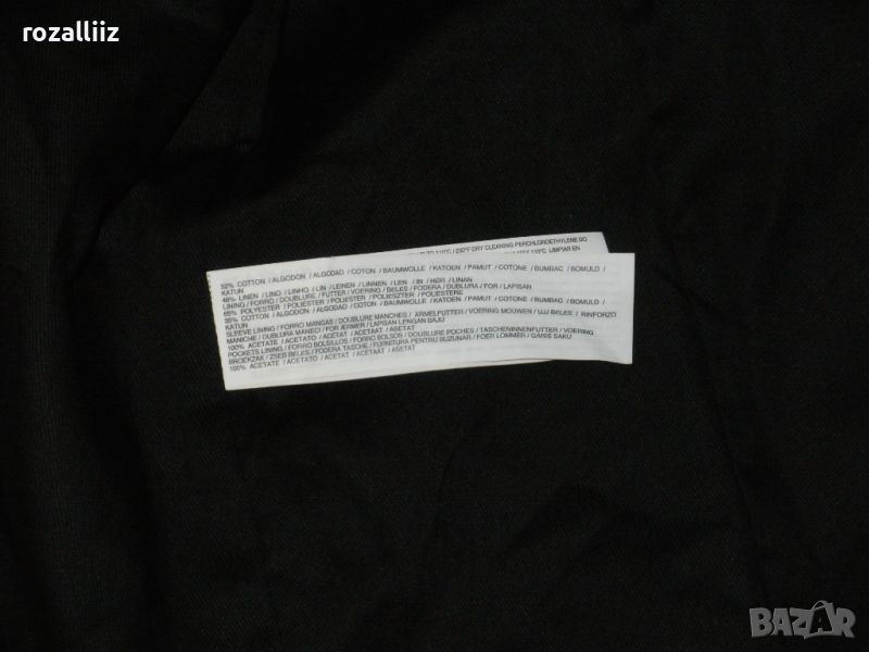 Сакото е на MANGO, оригинално, ново джобовете са зашити, по номер е XL. Цветовете са шампанско и черно. Закопчаването е двуредно. Материята е 52% памук и 48% лен, подплатата също е памук. Има лого на всички копчета.
