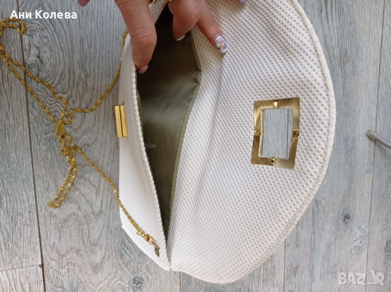 Чанта,плик в бяло до мръсно бяло, за офиц. случаи. Обков в черна тока и златни дръжки и катарама. Може да се държи в ръка, но и има скрита дълга дръжка за свободни ръце. Вътре няма прегради, но големината е оптимална. 31 см./15см. Материал еко кожа в релеф.