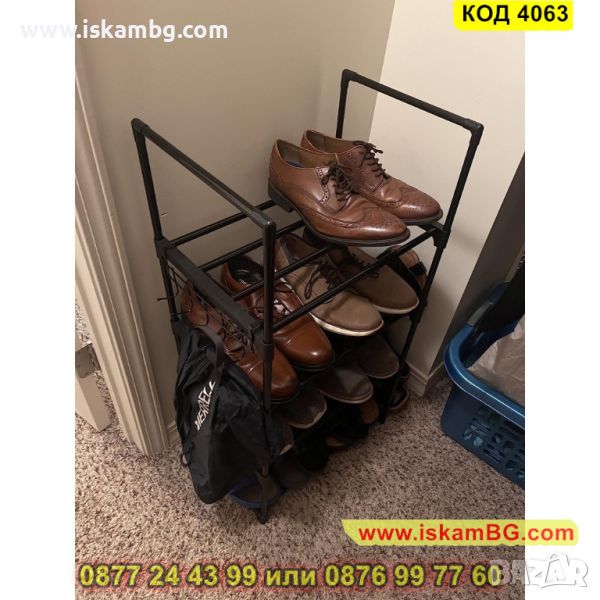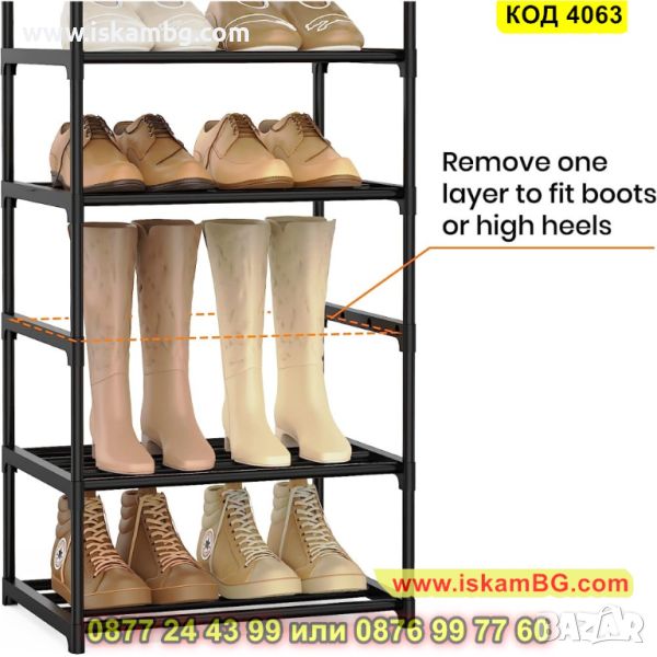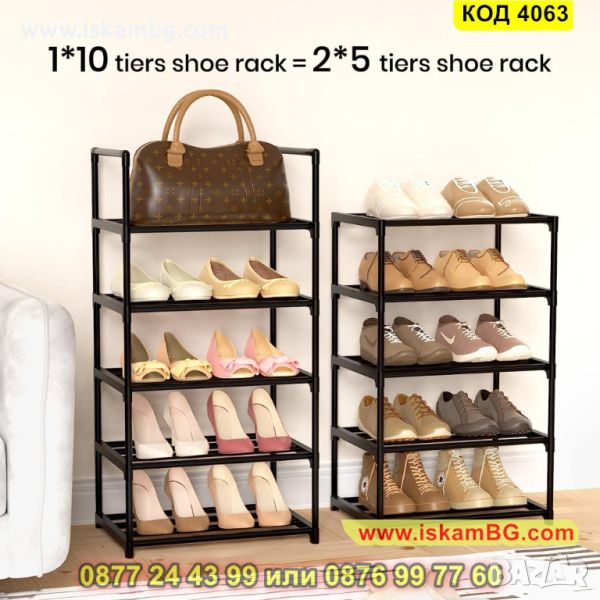 Нашата висока етажерка за обувки разполага с 10 рафта, където можете да съхраните любимите си обувки! В нея може да се съберат до 24 чифта обувки. Стелажът с 10 рафта е висок, със здрава конструкция. Дизайнът му е компактен и може да се побере и в малко пространство. Освен това, стелажът за обувки има възможност да се раздели на два отделни по-малки стелажа, всеки с по 5 рафта. Предлагаме стелажа в черен цвят с размери - 200 х 44 х 30 см.