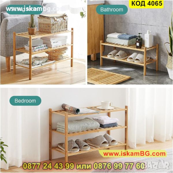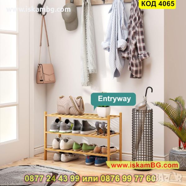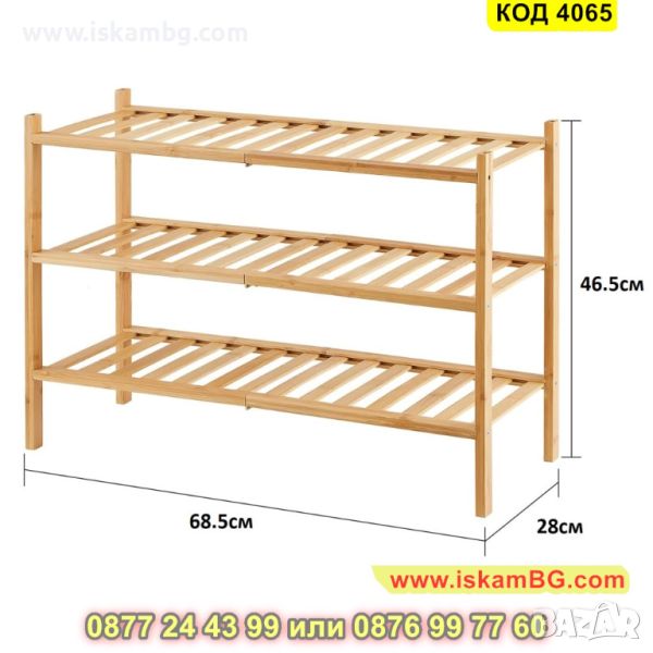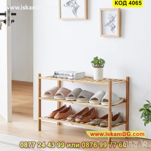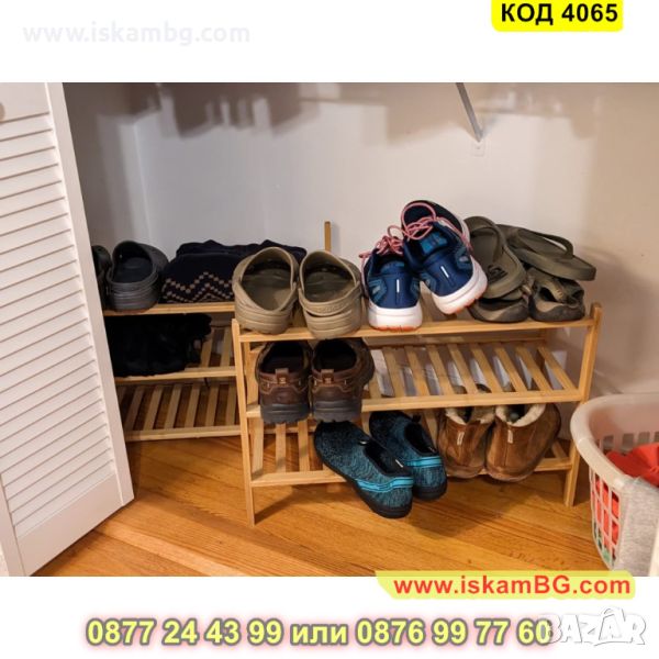 Стабилния екологичен стелаж за обувки от бамбук, който разполага с 3 рафта е перфектен за интериора у дома Ви и организацията на любимите Ви чифтове обувки. Нашият стелаж за обувки е направен от висококачествен бамбук, съчетаващ в себе си издръжливост и елегантност едновременно. С неговите 3 рафта на разположени Вие ще имате достатъчно пространство, за да подредите обувките си удобно и стилно.