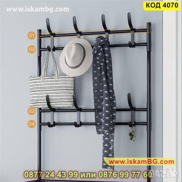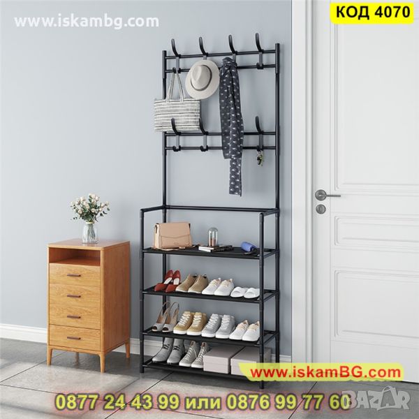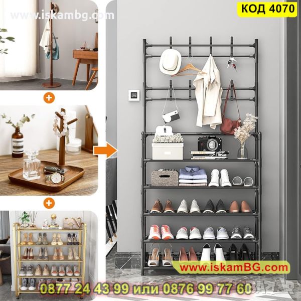 Мултифункционална етажерка, която може да се използва като стойка за обувки, закачалка за дрехи, шапки, обувки, чанти, чадъри и други.