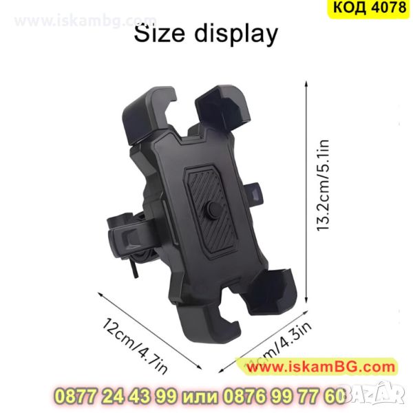 Стойка за колело или мотор, където да поставите мобилния си телефон удобно и здраво, без да се притеснявате, че ще падне. Тази стойка се заключва автоматично и фиксира телефона, така че да няма опасност той да падне! Изключително функционална, нашата поставка за телефони се завърта на 360 градуса и така можете лесно да регулирате желания от Вас ъгъл на гледане. Подарете си удобство на навигация или разговори по телефона, докато сте на пътя, а ръцете Ви са свободни. Поставката за колело и мотор е подходяща за телефони с размери от 4.5 до 7 инча. Предлага се в черен цвят. Размерите на стойката са: 13.2 х 11 х 12 см.