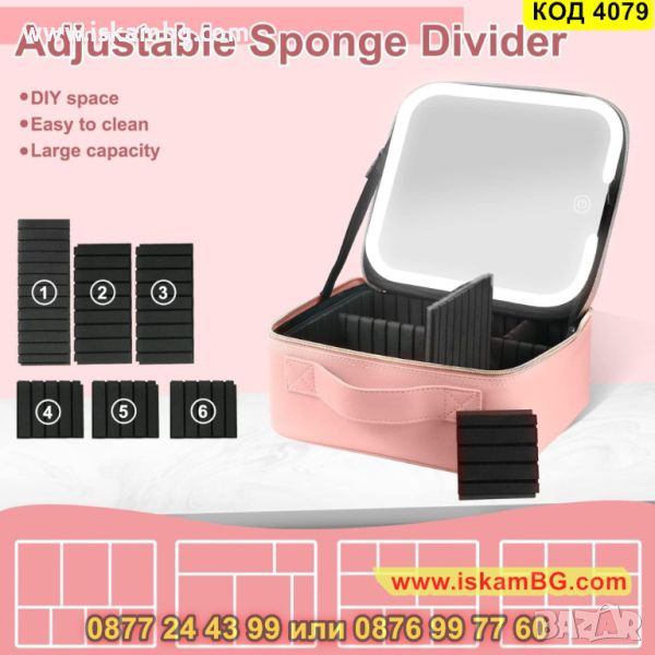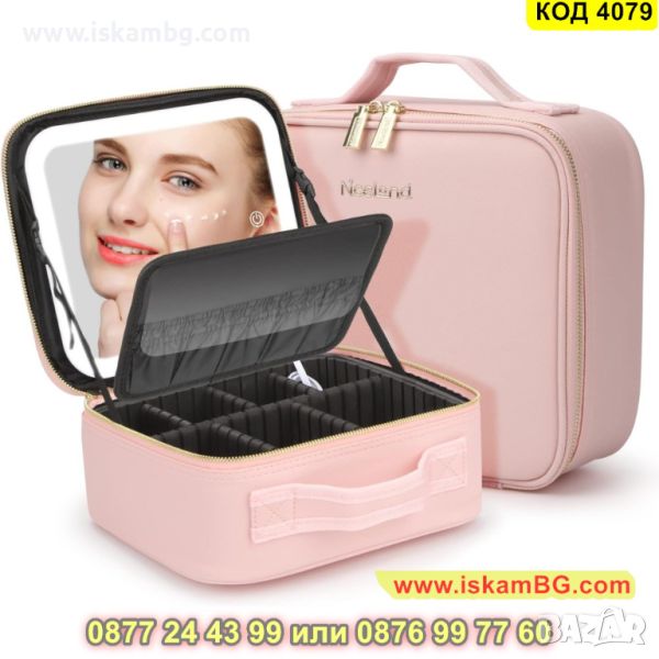 Куфар за грим в розов цвят с LED осветление в три цвята и огледало - КОД 4079