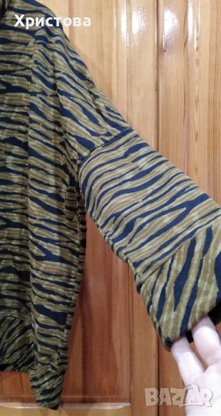 Свободен блузон с поло яка в зелено(каки), тъмно синьо и бежово, на неправилни черти, с паднал, стеснен ръкав.