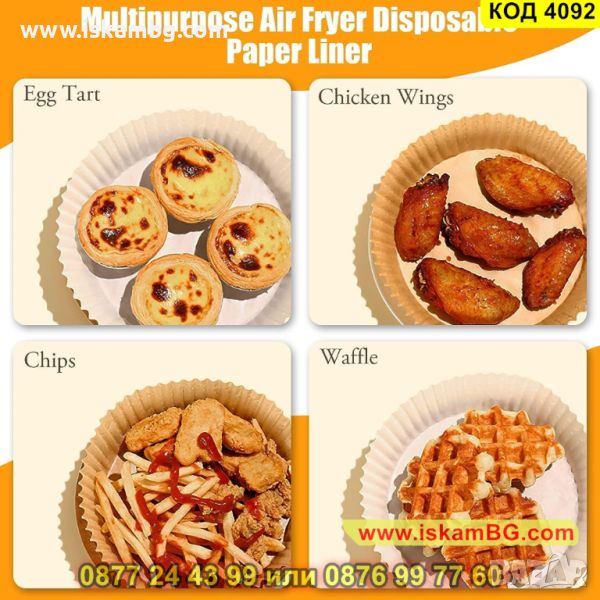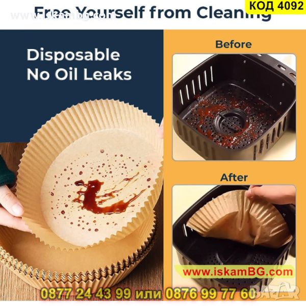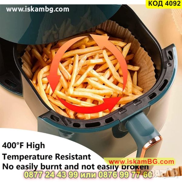 Комплектът, който Ви предлагаме се състои от 50 броя хартиени подложки, които са термоустойчиви и подходящи за еднократна употреба за Еър Фрайър. Пергаментовата хартия е специално проектирана, така че да предпазва фритюрника Ви от залепване на храна, като го поддържа чист. Благодарение на повдигнатия ръб на хартията, чиято височина е около 5 см се предотвратява залепването на храна по тигана. Запазете вкуса на любимата си храна, използвайки тези хартиени подложки за Air Fryer.