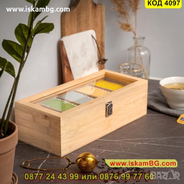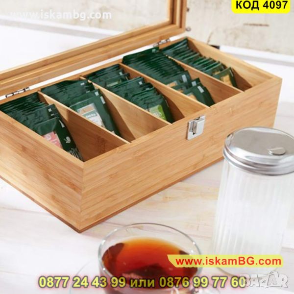 Дървената кутия за съхранение на чай е перфектен избор за всички любители на чайовете, които ценят запазването на аромата му. Кутията е направена от висококачествен материал - 100% естествен бамбук и притежава 5 отделения, всяко от което има размери - 14.3 х 6.5 х 7.3 см. Стилна и практична, тази дървена кутията за чай е перфектен подарък и аксесоар за всяка кухня! Запазете аромата на пакетчетата чай с месеци наред, съхранявайки ги в кутията от 100% естествен бамбук. Допълнителен плюс на дървената кутия за съхранение на чай е, че всеки отдел на тази кутия има капацитета да събере до 60 чаени пакетчета. Това го прави удобен, гарантирайки, че кухненските Ви шкафове ще бъдат подредени винаги!