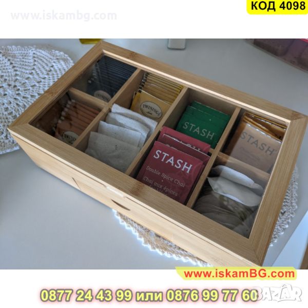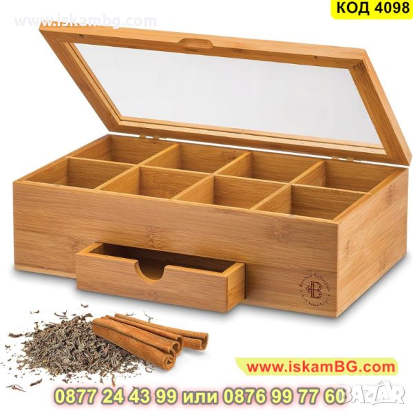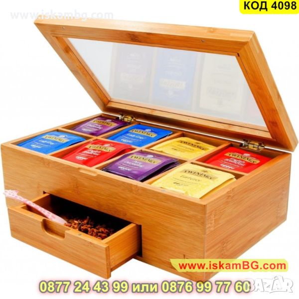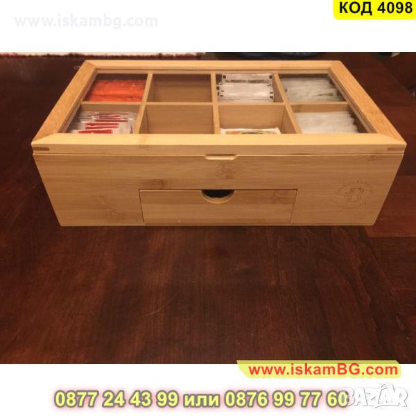 Кутия за съхранение на чай със стъклен капак и 8 отделения плюс чекмедже - КОД 4098