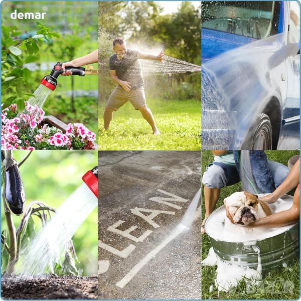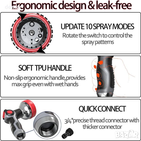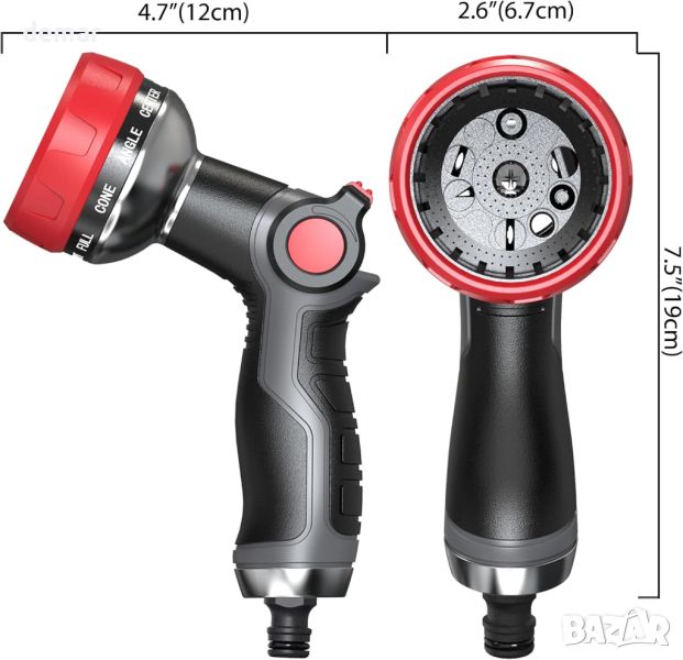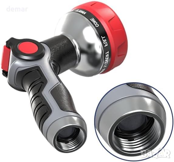 Пистолетът за пръскане с маркуч е изработен от издръжливи материали, като предлага издръжлива и здрава структура за силен воден поток, повишавайки ефективността при поливане на градината. Той разполага с 10 регулируеми модели на пръскане, включително струя, душ и мъгла, лесно превключвани чрез въртяща се дюза, за да отговарят на различни нужди. Лесен за използване контролер с палец опростява работата, спестявайки време и усилия. Освен това, пистолетът е снабден с водоустойчива, противоплъзгаща се гумена дръжка за удобен захват и е съвместим с всички стандартни градински маркучи, осигурявайки лесен монтаж и използване.