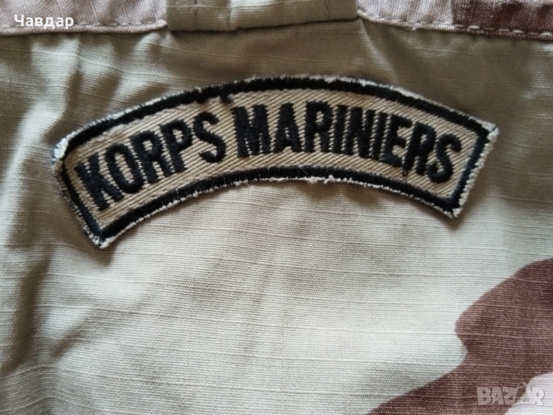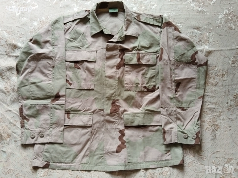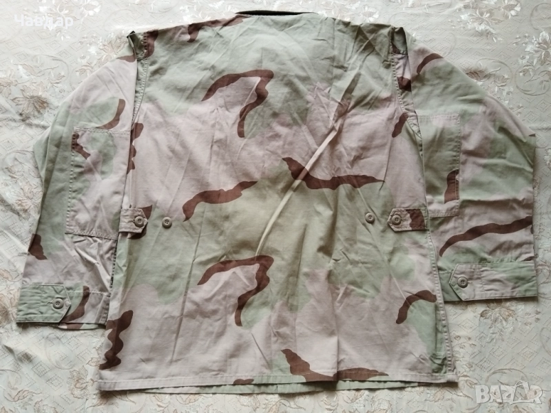 3. Яке (куртка) модел BDU произведена в САЩ за холандската кралска морска пехота. Пустинен камуфлаж "триколор". Плат рипстоп 100% памук. Размери: от рамо да рамо - 54 см, подмишници - 68 см. Височина от края до яката (гръб) - 76 см., дължина на ръкава външно - 64 см., дължина вътр. - 60 см. Реално отговаря на размер XL. Състояние - отлично (практически като ново). Цена - 25 евро.