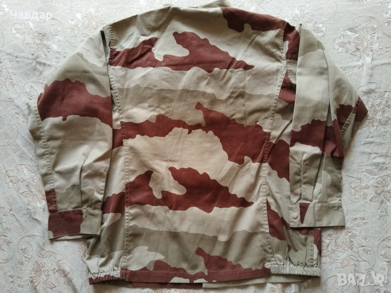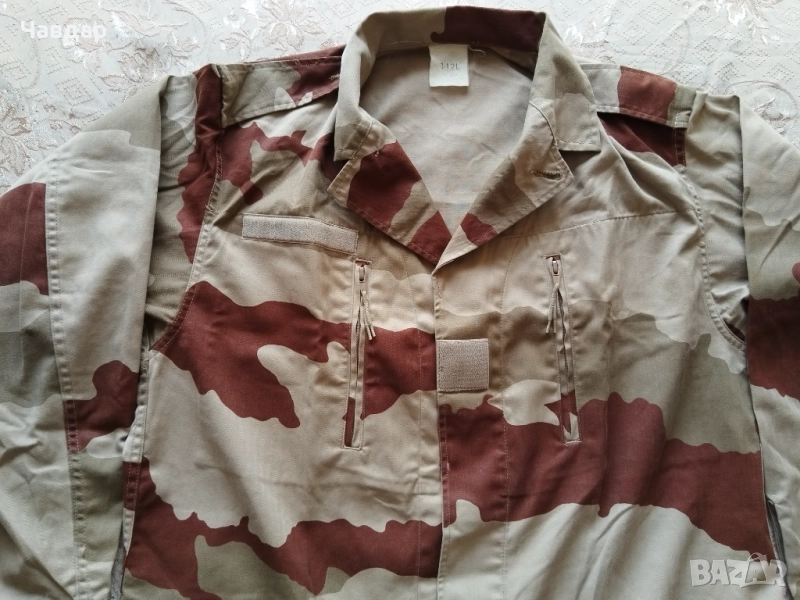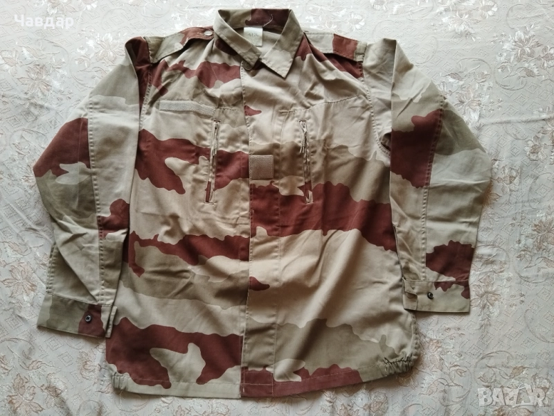 2. Френско военно яке, трицветен пустинен камуфлаж (рядък образец). Размер XL. Размери в сантиметри: от рамо до рамо - 52 см., подмишници - 70 см., височина от края до яката (гръб) - 80 см., дължина на ръкава външно - 65 см., вътрешно - 60 см. Състояние - отлично. Цена - 35 евро.