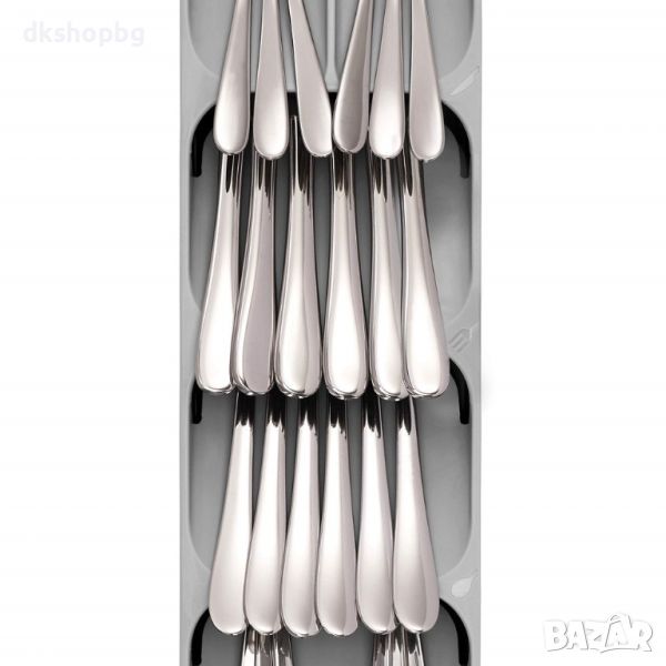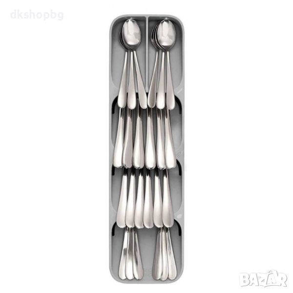 Компактен органайзер за прибори има изчистен дизайн в правоъгълна стеснена форма, разграфена на четири отделения за всички прибори - три големи и едно по-малко. По-малките са идеални за чаени лъжички и вилички.