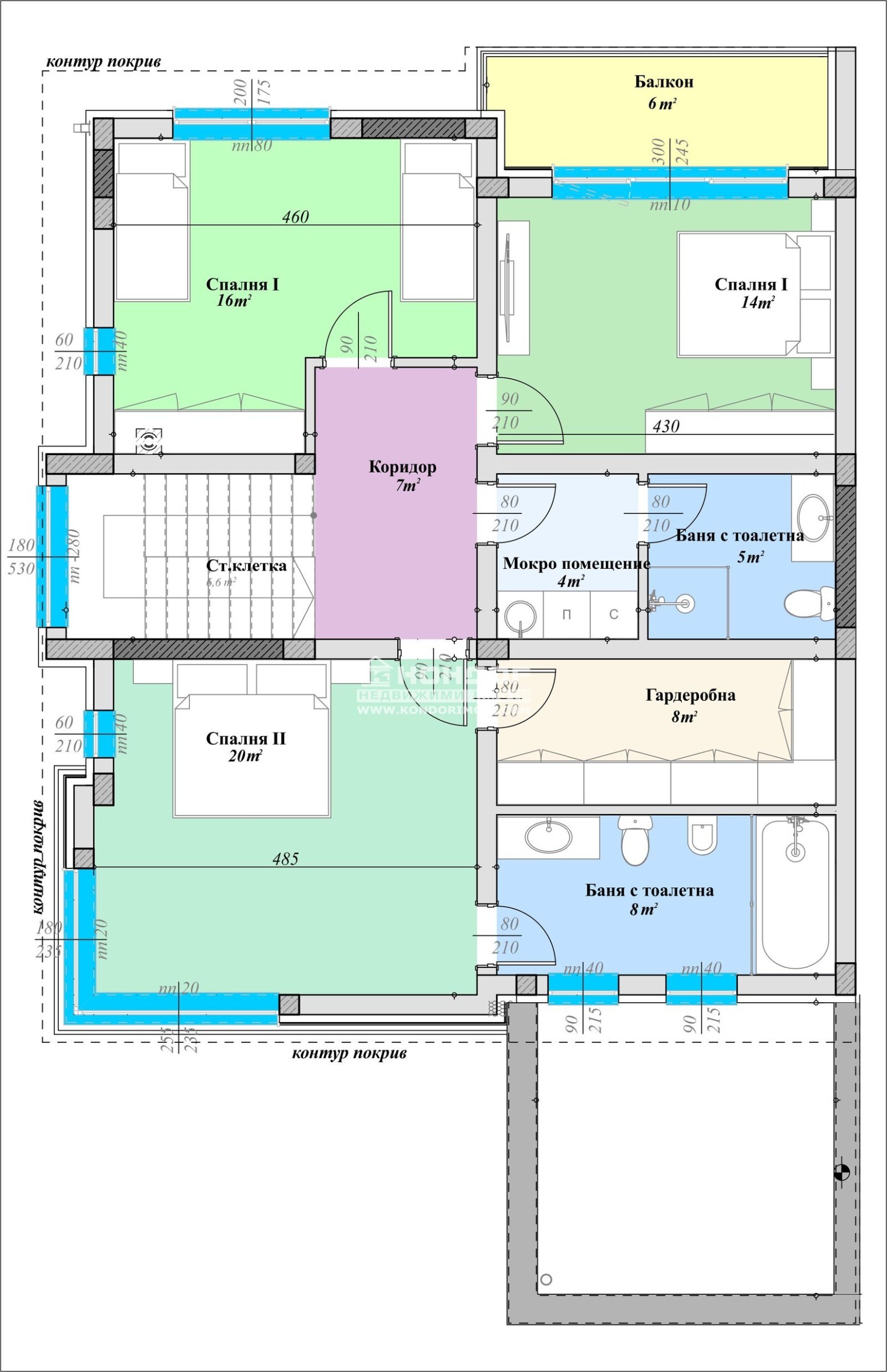 Второто ниво е разпределено като две детски стаи с балкон, баня с тоалетна, голяма родителска спалня със собствен санитарен възел и гардеробна, антре и мокро помещение.