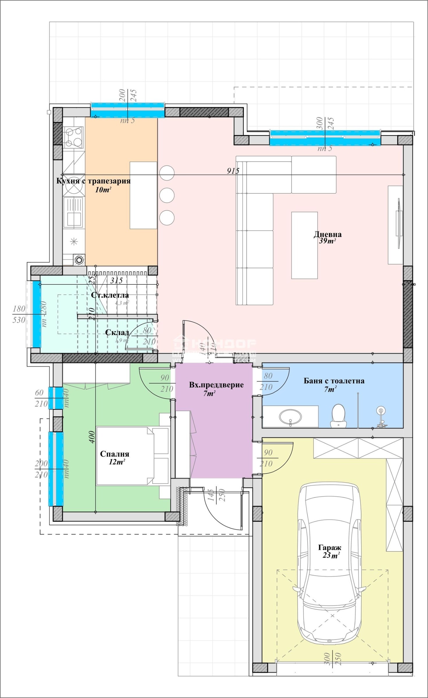 На първото ниво са разположени антре, голяма и просторна всекидневна с кухненски бокс и трапезария, спалня, санитарно помещение, склад и гараж с топла връзка.