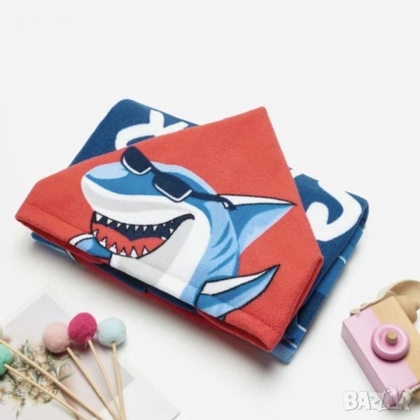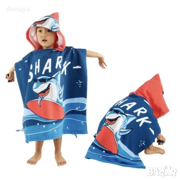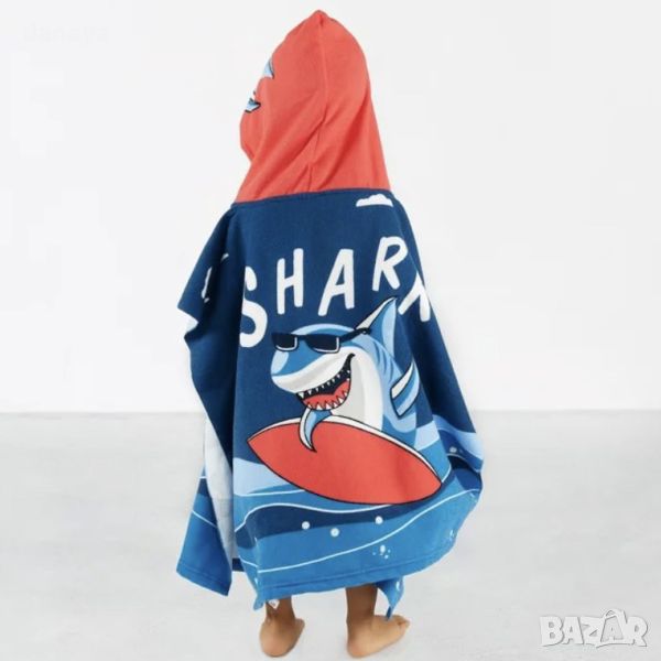 Плажно пончо за деца в супер свежи цветове. Плажна хавлия, тип пончо с принт на “страшна” акула с червен сърф. Удобен плажен халат с голяма качулка и атрактивен принт, който впечатлява децата. Супер мекичка детска хавлия пончо за малки страшни акули! Подходящо за деца до 10 годишна възраст или височина на детето до 130см.