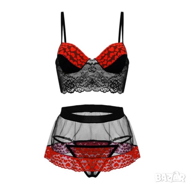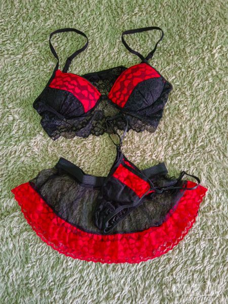 Дамско красиво бельо 3 части в цвят черно и червено.Подходящо за размер С и М.Горната част е с ластик-еластична,прашките се регулират.