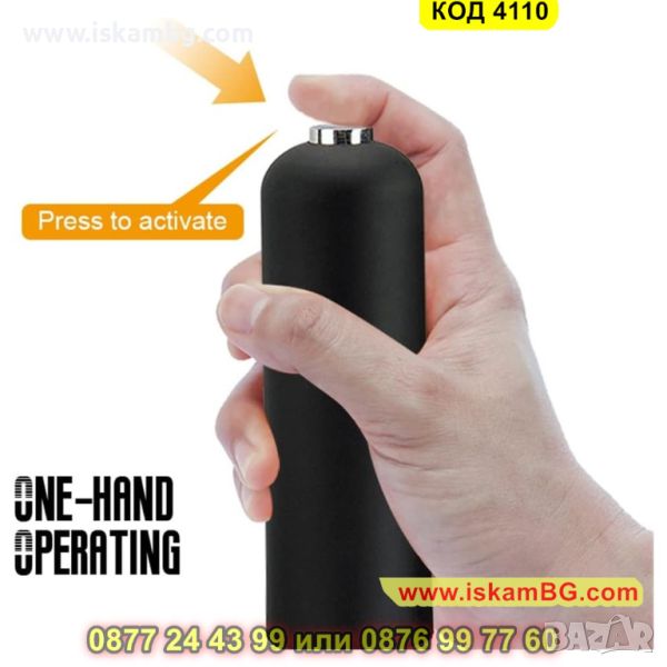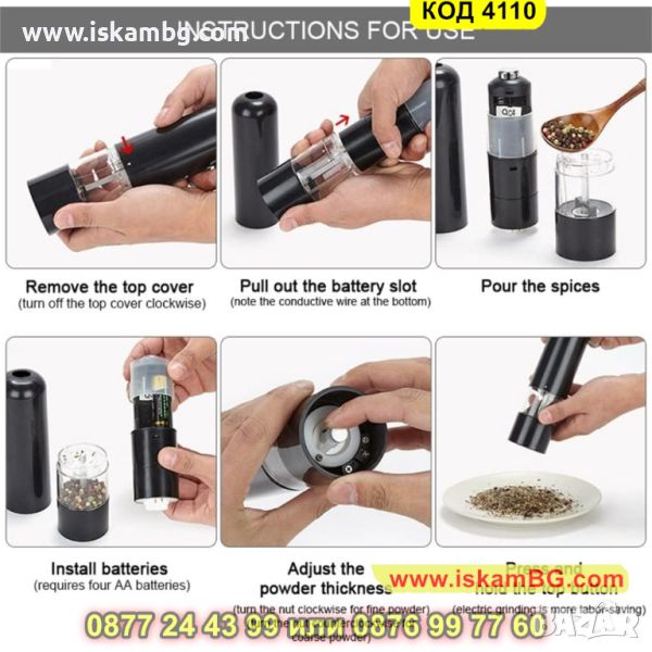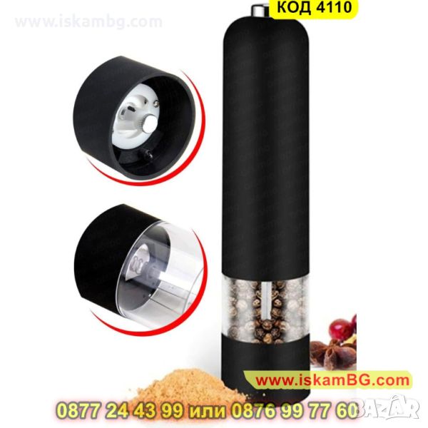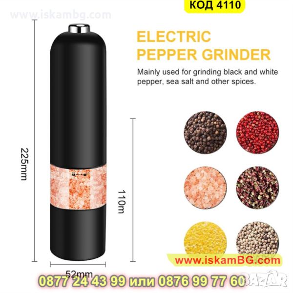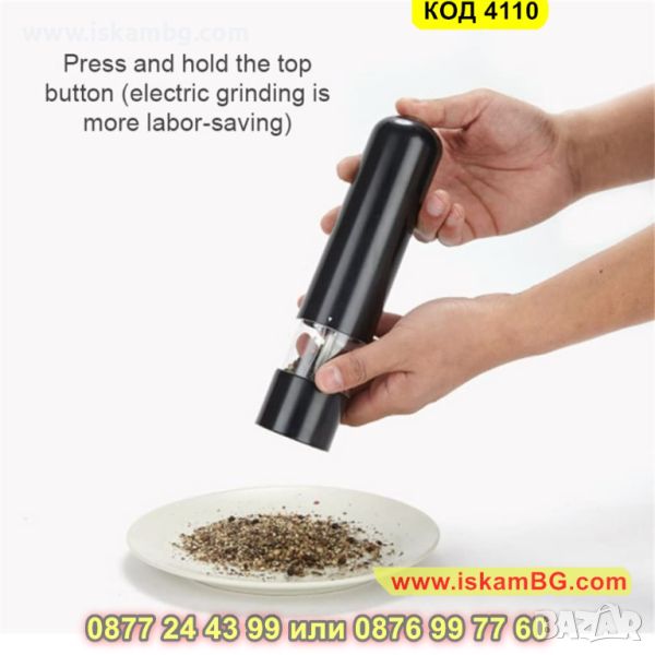 Електрическата мелница, която Ви представяме е голяма и предназначена за лесно и бързо смиляне на черен пипер, сол и други видове подправки. С помощта на само един бутон Вие ще обработите желаната подправка от Вас! Забравете за досадното и изморително ръчно мелене с нашата електрическа мелничка за подправки.