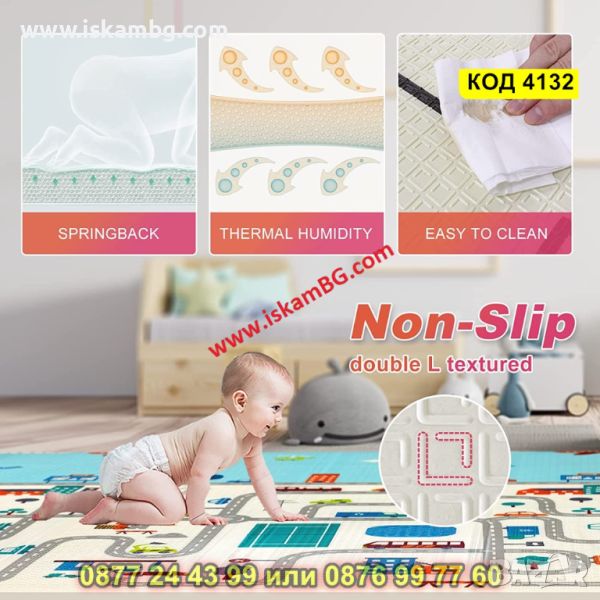 Килимчето изолира перфектно от студеният под. Меко е и комфортно, но в същото време достатъчно плътно и устойчиво на натиск. Чудесно буферира и обира удара при евентуално падане на детето. Осигурява защита на костното развитие на бебетата, като предпазва коленете при пълзене.