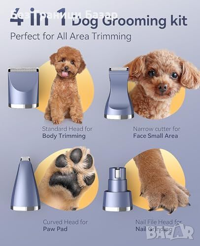 Комплект за подстригване 4 в 1: Включва тример за лапи, шлифовъчна машина за нокти и тример за малки кучета.