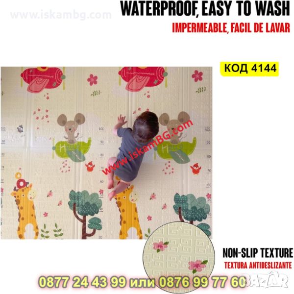 Двустранно, сгъваемо килимче за пълзене и игра от XPE пяна. Материалът, от който е изработено килимчето е нетоксичен и напълно безопасен, което го прави подходящ за употреба от деца, дори и в най-ранна възраст.