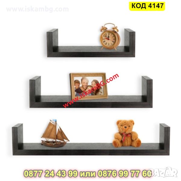 Комплект 3 броя дървени П-образни етажерки за стена със скрити подпори в цвят венге - КОД 4147 → Обява 45509986