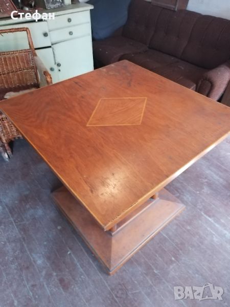 Масата е австрийска 1930г.Здрава е,има барче и вратата също е здрава.Размерите са 90/90см.а височината е 82см.Идеална за игра на карти,табла и друго.