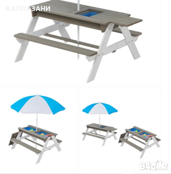 ЗДРАВА И СТАБИЛНА КОНСТРУКЦИЯ: Изработена от масивна елхова дървесина, боядисана на водна основа, детската градинска маса с вода и пясък може да издържи теста на времето и има голям капацитет на натоварване до 100 кг. Освен това, регулируемият чадър е изработен от стомана и текстил с anti-UV материал, за превъзходна издръжливост на атмосферни влияния.