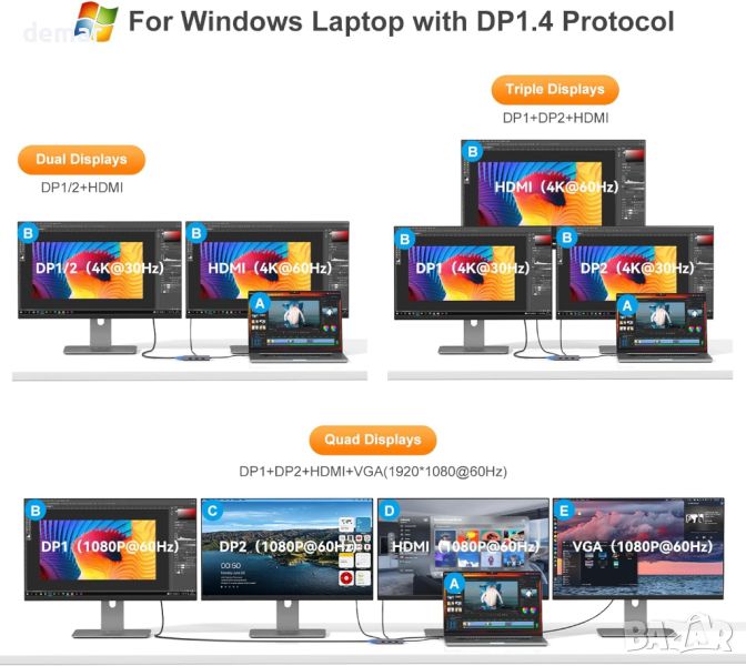 Този многофункционален USB-C хъб трансформира един Type-C/Thunderbolt 3/4 порт в 8 полезни порта: два 4K DisplayPorts (30Hz), 4K HDMI порт (60Hz), 1080p VGA изход (60Hz), три USB 2.0 порта (480Mbps) и 100W USB-C PD порт за зареждане. Той поддържа функция plug-and-play без необходимост от драйвери, улеснявайки двойни, тройни или четворни настройки на дисплея в Windows, въпреки че macOS поддържа само огледален режим. Проектиран за широка съвместимост, той работи с различни лаптопи, включително модели от Dell, HP, Lenovo и Microsoft Surface. Забележка: USB-C PD портът не поддържа прехвърляне на данни или извеждане на дисплея и изисква 65 W или по-високо зарядно устройство (не е включено).