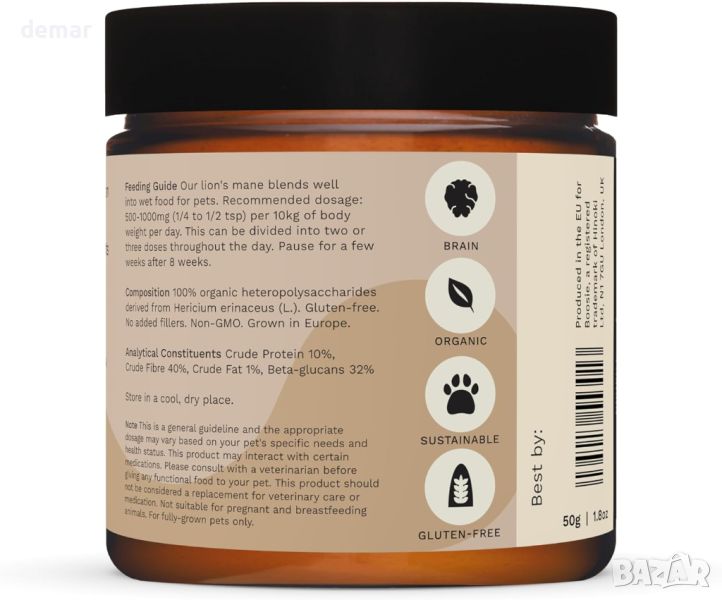 Boosie's Lion's Mane Mushroom Supplement е предназначена да поддържа когнитивната функция при домашните любимци, включително паметта и ученето. Всеки грам съдържа 32% бета-глюкани и 1,5 mg еринацин А, което го прави много мощен в сравнение с други продукти. Отгледан върху естествени и органични субстрати в Европа, той преминава строги проверки на качеството от независими лаборатории. За хранене смесвайте 1/4 до 1/2 чаена лъжичка на 10 kg телесно тегло всеки ден в мократа храна на вашия домашен любимец, която може да се разпредели между храненията. Препоръчва се да се направи почивка след 8 седмици непрекъснат прием. Boosie, кръстен на котката Butch на основателя, която тества всяка партида, има за цел да осигури висококачествени, обогатени с растения храни за дългосрочно здраве и щастие на домашните любимци.