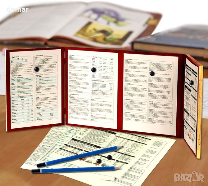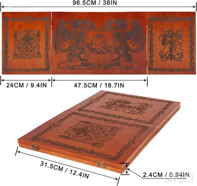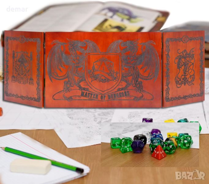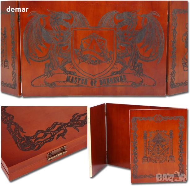 Този вдъхновен от Dungeons & Dragons екран Dungeon Master е изработен от висококачествена дървесина за издръжливост с класическа естетика. Той разполага със сгъваем дизайн с четири панела със сложно лазерно гравирано произведение на изкуството, което подобрява игровата атмосфера. Всеки панел включва интегрирани магнитни държачи за сигурно показване на информация, свързана с играта, като карти и бележки, което го прави едновременно практичен инструмент и завладяващо допълнение към вашата игрова настройка. Освен това е сгъваем за лесно съхранение и транспортиране, което го прави идеален за Dungeon Masters, които се нуждаят от уединение и функционалност по време на игра.