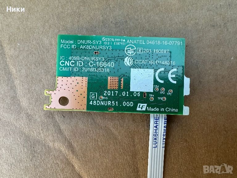 Wi-Fi MODULE DNUR-SY3 / 1-458-959-13 от телевизор Sony KD-43XF7004 Модула е работеща и свалена от работещ телевизор с чупен дисплей, модела на дисплея е YS8S430HNG01. Изпращам по