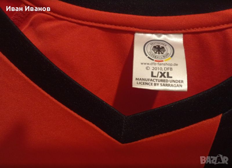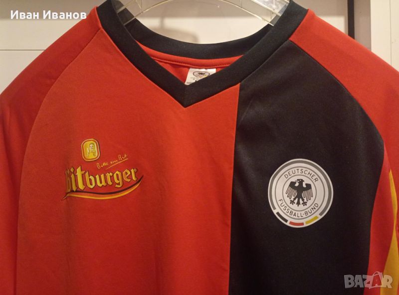 Уникална оригинална фланелка на националния отбор по футбол на Германия. Екипа е юбилеен по случай 60г. Германски футболен съюз(основан е 1950г.) - екипът е от 2010г. Bitburger е най-старата немска бира - 1817г. и най-продаваната в страна - спонсор са на националния отбор по футбол на Германия, както и на някои от по-големите отбори в страна. BH-Club 4po е спортен клуб за смесени спортове в страна. Тези юбилейни екипи не бяха пускани за свободна продажба, а само предварителна заявка с номер и име по желание на купувача. Тениската е закупена именно от този спортен клуб в Берлин. Фланелката е в перфектно състояние, не е обличана, само е съхранявана. Всички етикети и серийни номера са налични. Размер Л/ХЛ.