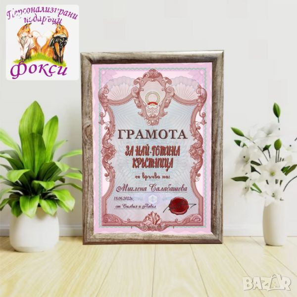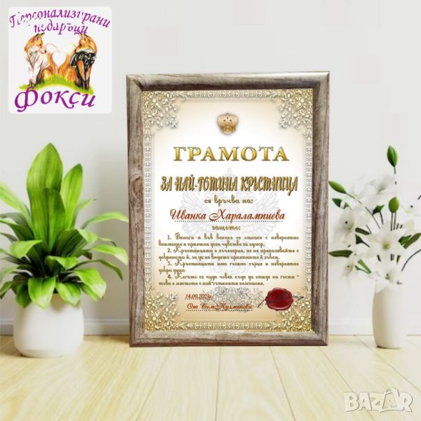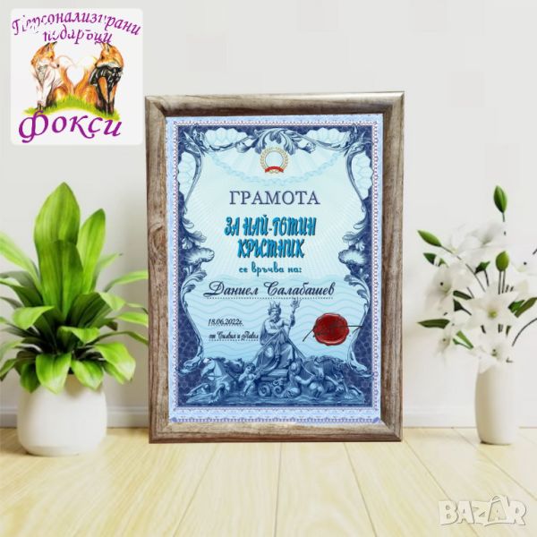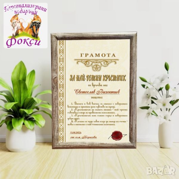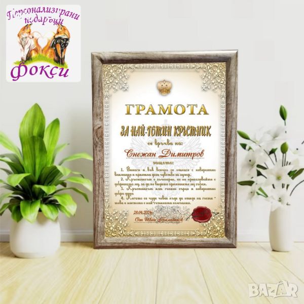 Грамота в рамка за Свето Кръщение за подарък за Кръстници, с надпис и забавен интересен текст
