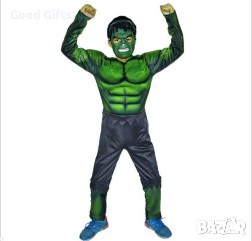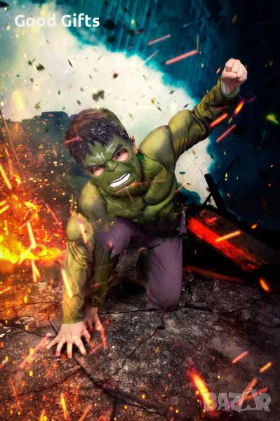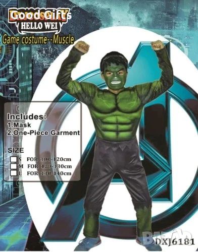 Детският костюм за Хълк с мускули се предлага в три размера: