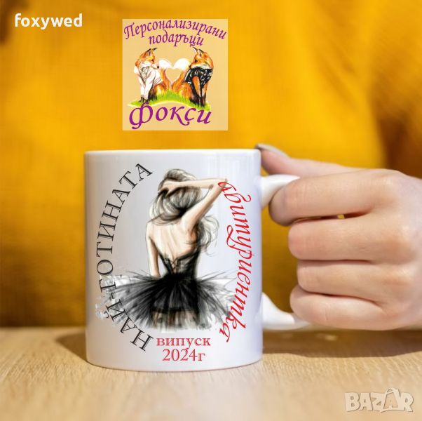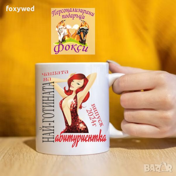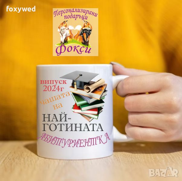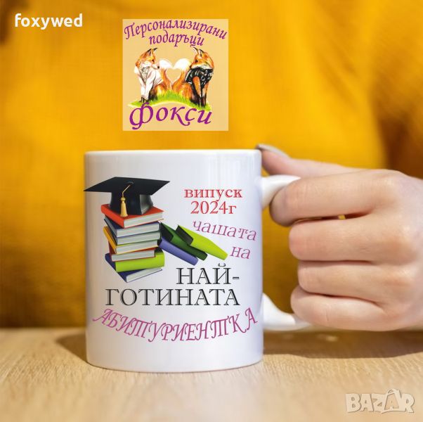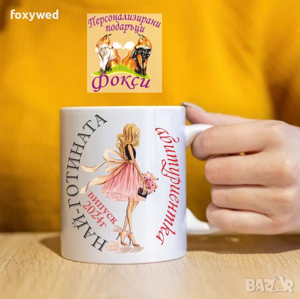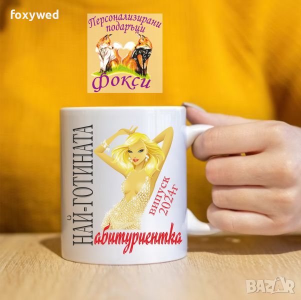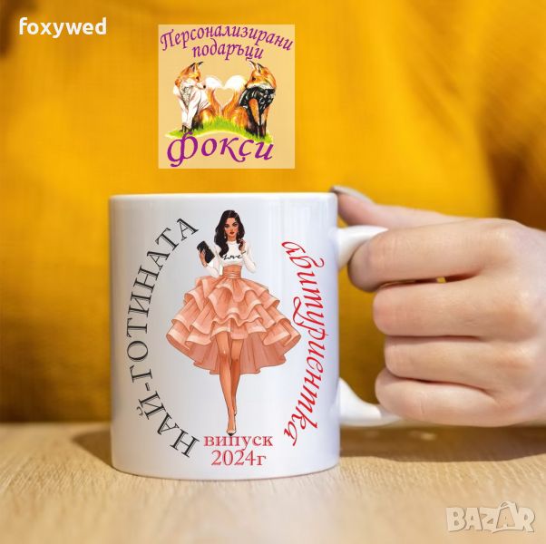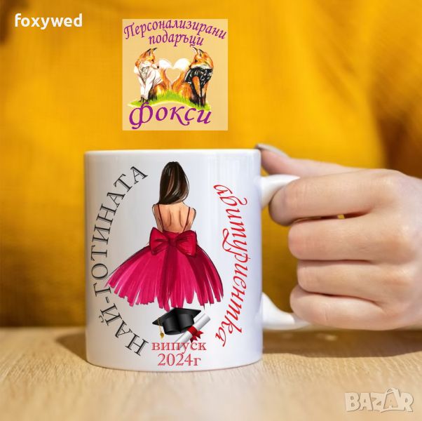 Красива керамична чаша с интересен принт и надпис „Най-готината абитуриентка, випуск 2024г.“