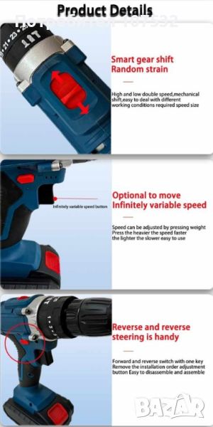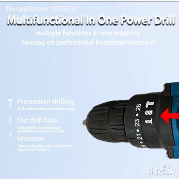 Представяме ви Новата машина за пробиване и завинтване в куфар!Високоскоростно пробиване: Достигнете скорости до 1600 оборота в минута с този 21V акумулаторен ударен винтоверт, което прави бърза всяка задача за пробиване. Акумулаторна батерия: Предлага се с две 1300*5 mah батерии за продължителна употреба без необходимост от постоянно зареждане. Променлив въртящ момент: Регулирайте до 32 настройки на въртящия момент, за да боравите с лекота с различни материали за пробиване. Разнообразна употреба: Тази домакинска електрическа бормашина се предлага с разнообразие от свредла и аксесоари, идеални за всички ваши нужди от пробиване. Преносим и удобен: Компактният дизайн и включеното зарядно устройство улесняват използването на тази бормашина в движение и гарантират, че е винаги готова за употреба. Спецификации: Този продукт има няколко варианта, този вариант е: Kit, EU Напрежение: 21V Двойка: 32 Капацитет на батерията: 1300*5 mAh Скорост: 0-350rpm/0-1350rpm Брой батерии: 2 Тип батерия: презареждаема Включени аксесоари: 24 свредла Източник на захранване: безжичен Приложение: домакинство Сертификация: CE, RoHS Цвят: черен и червен Тип бормашина: Ударна бормашина Максимална скорост: 1600 об./мин Включено зарядно: Да. Цена. 82 лв.
