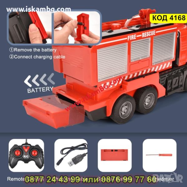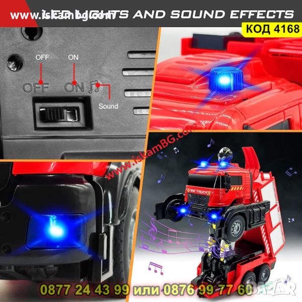 Натискането на бутона под колата докрай издава звуци на пожарната, горните светлини светват, а когато колата се движи с дистанционното управление, слабите светлини също светват