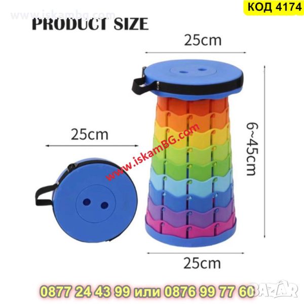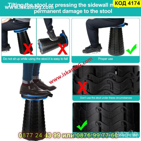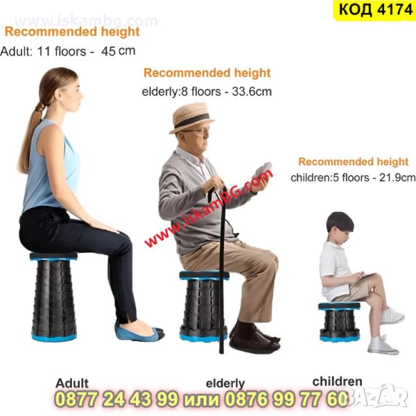 ❤️Напълно разгънатата табуретка е с височина 45см! Структурата на табуретката ви позволява да я поставите в 9 позиции !Само я заключете на избраното място при разгъване! Сгънатата табуретка ще работи чудесно и като столче за риболов, излет, къмпинг или просто като преносимо столче за възрастни хора! За разгъване на табуретката : Хванете дръжките на седалката и в същото време дъното на табуретката. Внимателно завъртете дръжките наляво и изпънете табуретката на подходящата височина. Уверете се, че заключващите зъби са заседнали в ключалките в правилната позиция. Насладете се на удобна седалка!