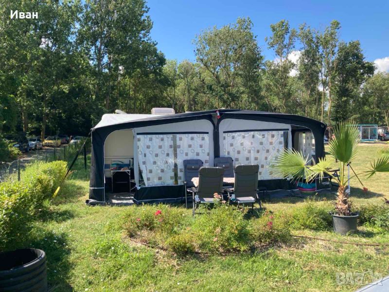 Дишаща непромокаема материя С двупосочни ципове позволяващи отваряне на всички страници както отгоре-надолу, така и странично. Може да се обособява врата, както отпред така и от двете страни. И четирите страници могат да бъдат частично отворени образувайки веранда или премахнати напълно. Конструкция със стоманени рейки.С комарници. С комплект пердета. С пети за закрепване към караваната. С пола за под караваната + елиминатор за гумата.С комплект за приковаване (ластици тип стълбички и колчета за земя)