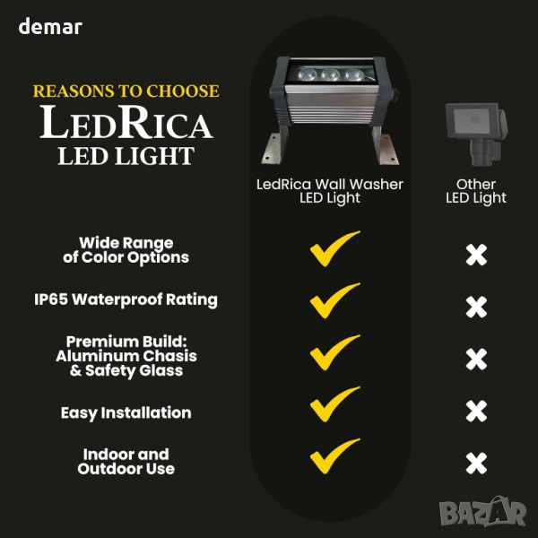 Високоефективните стенни лампи на LedRica са универсални вътрешни и външни осветителни тела с двойно предназначение, които осигуряват широко разпределение на светлината, подобрявайки всяко пространство естетически и функционално. Тези светлини могат да се монтират на стени или на земята и са гъвкави при позициониране, идеални за различни настройки като всекидневни, спални и градини. С водоустойчив рейтинг IP65 те издържат на разнообразните метеорологични условия, гарантирайки издръжливост. Те разполагат със здраво алуминиево шаси, 5 мм безопасно стъкло и се доставят с необходимия монтажен хардуер. Обърнете внимание, че тези лампи са предназначени за директно свързване към водоустойчива съединителна кутия и не включват щепсел.
