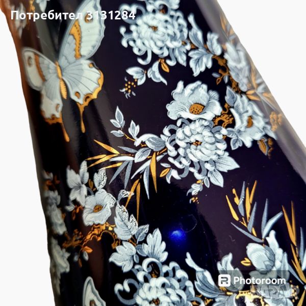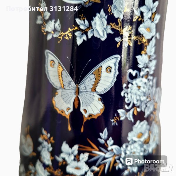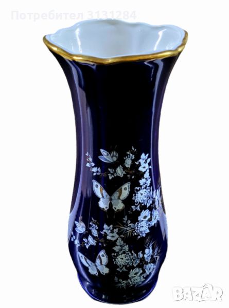 Великолепна ръчно рисувана кобалтова ваза от румънската фабрика Apro миналия век. Цветя пеперуди злато...приказка.... Височина 26 см. Идеално състояние, като нови.